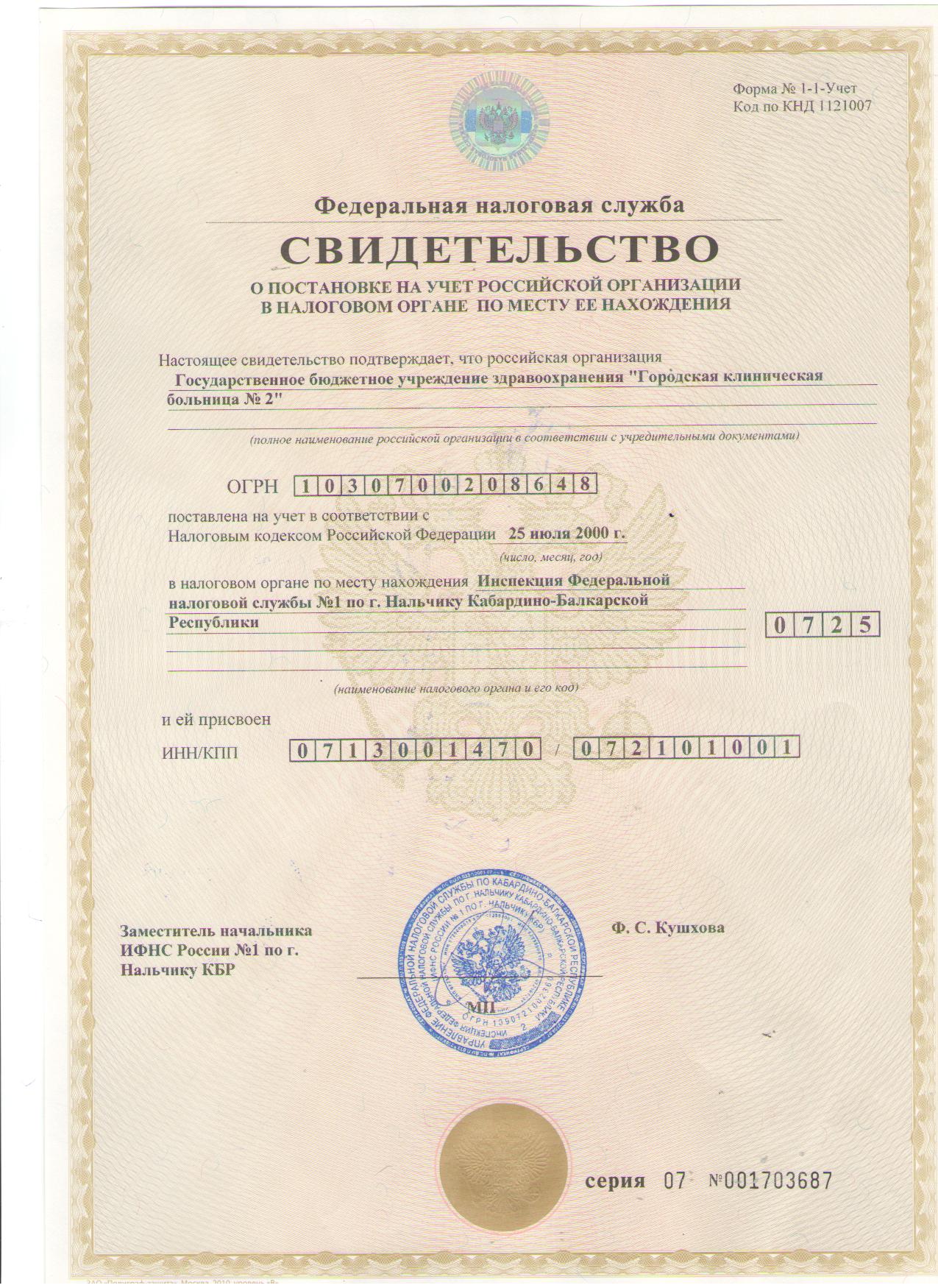 Свидетельство о постановке на учет российской организации в налоговом органе по месту ее нахождения